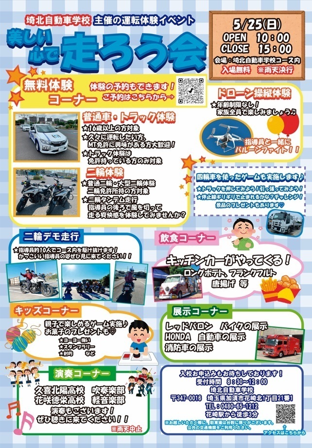 運転体験の他に、キッズコーナー(射的やヨーヨーすくい)、車両展示(警察車両、消防車両、HONDA、バイク)、近隣の高校の演奏会(吹奏楽部)、指導員によるバイクデモ走行を実施予定でございます。