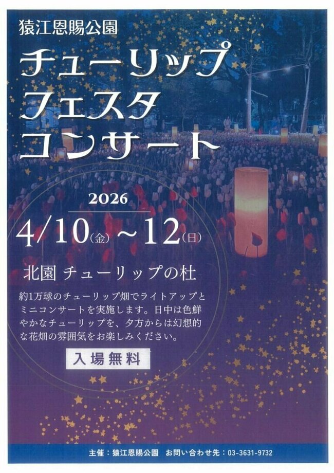 1万球以上のチューリップが咲く花壇で夕方からライトアップならびにコンサートを実施します。まだ肌寒い季節なので温かいもののご提供などが大変喜ばれます。