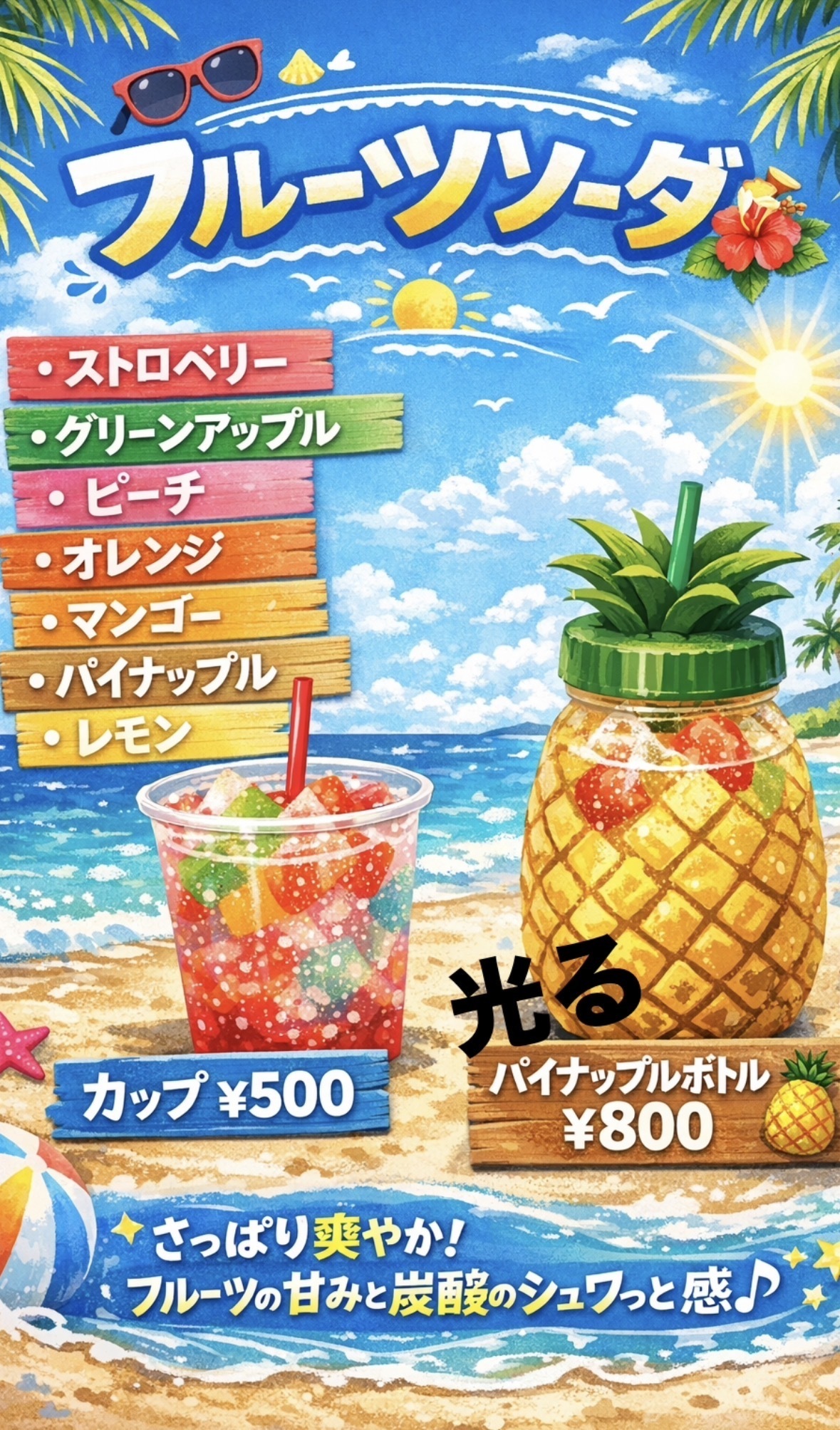 オムハヤシ、たこ焼き4種盛り、果肉入り本格かき氷、唐揚げ、幸せの玉子サンド、40センチロングチュロス、フライドポテト、たません、フランクフルト、手作り味噌の有機野菜の具沢山豚汁、だし巻き卵、日替わり丼、アルコール、ラムネ、カラフルソーダ、かき氷、ロコモコ丼、濃厚カップアイス、アイスフロート、たこせん、焼きそば、フルーツサンド、たこ焼き