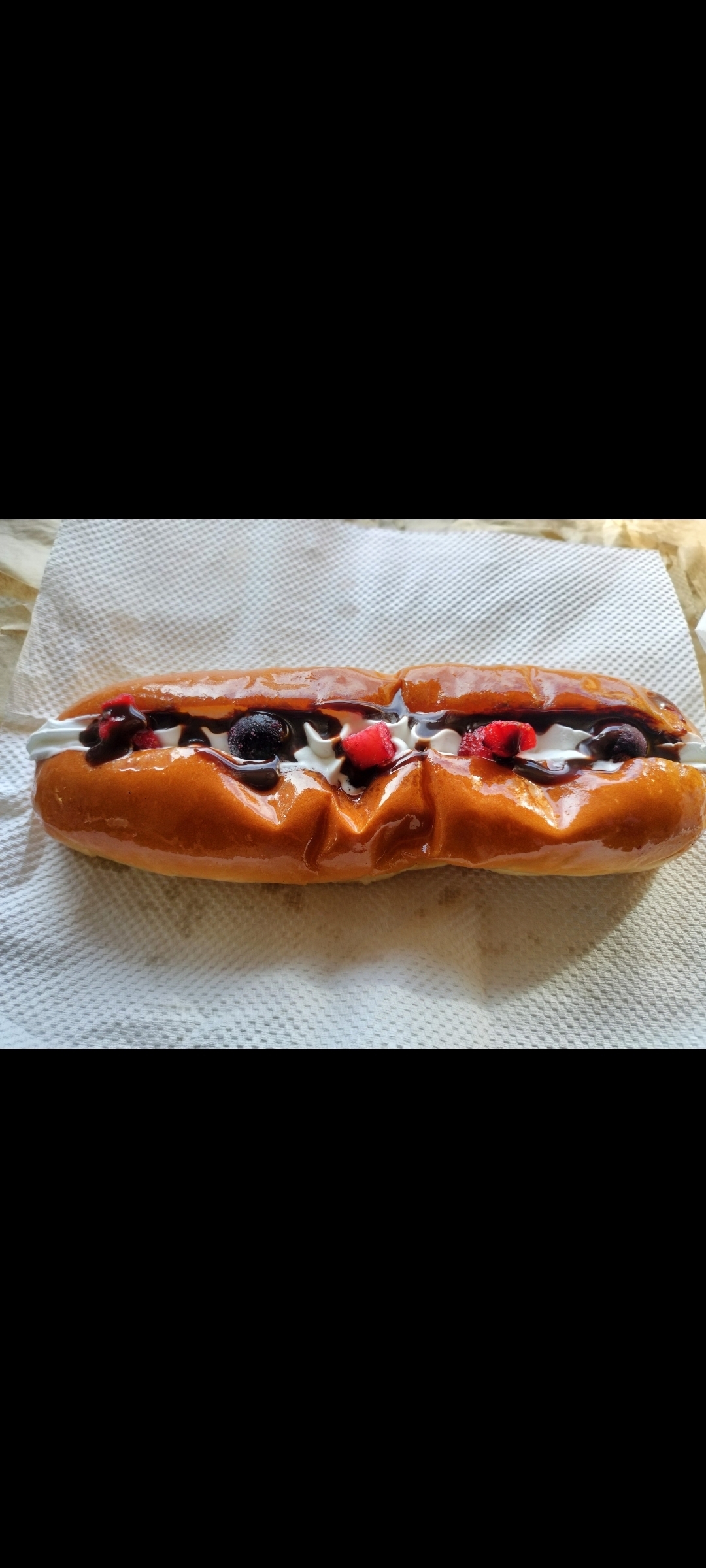揚げパンホイップクリームベリーミックス入りチョコソース掛け