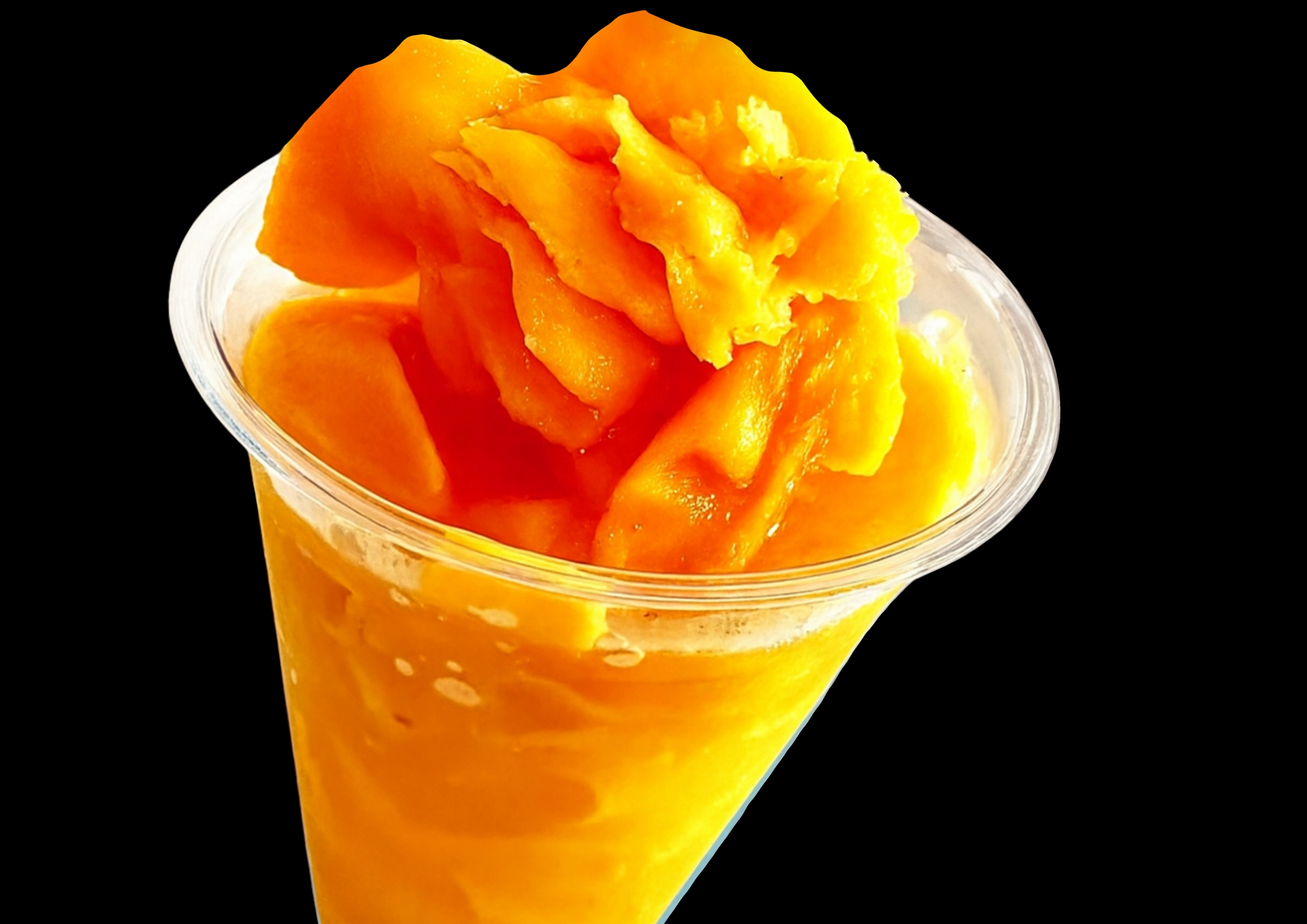 大きめのコップにたっぷりのマンゴーソーダ。その上に削った冷凍マンゴーをトッピング。