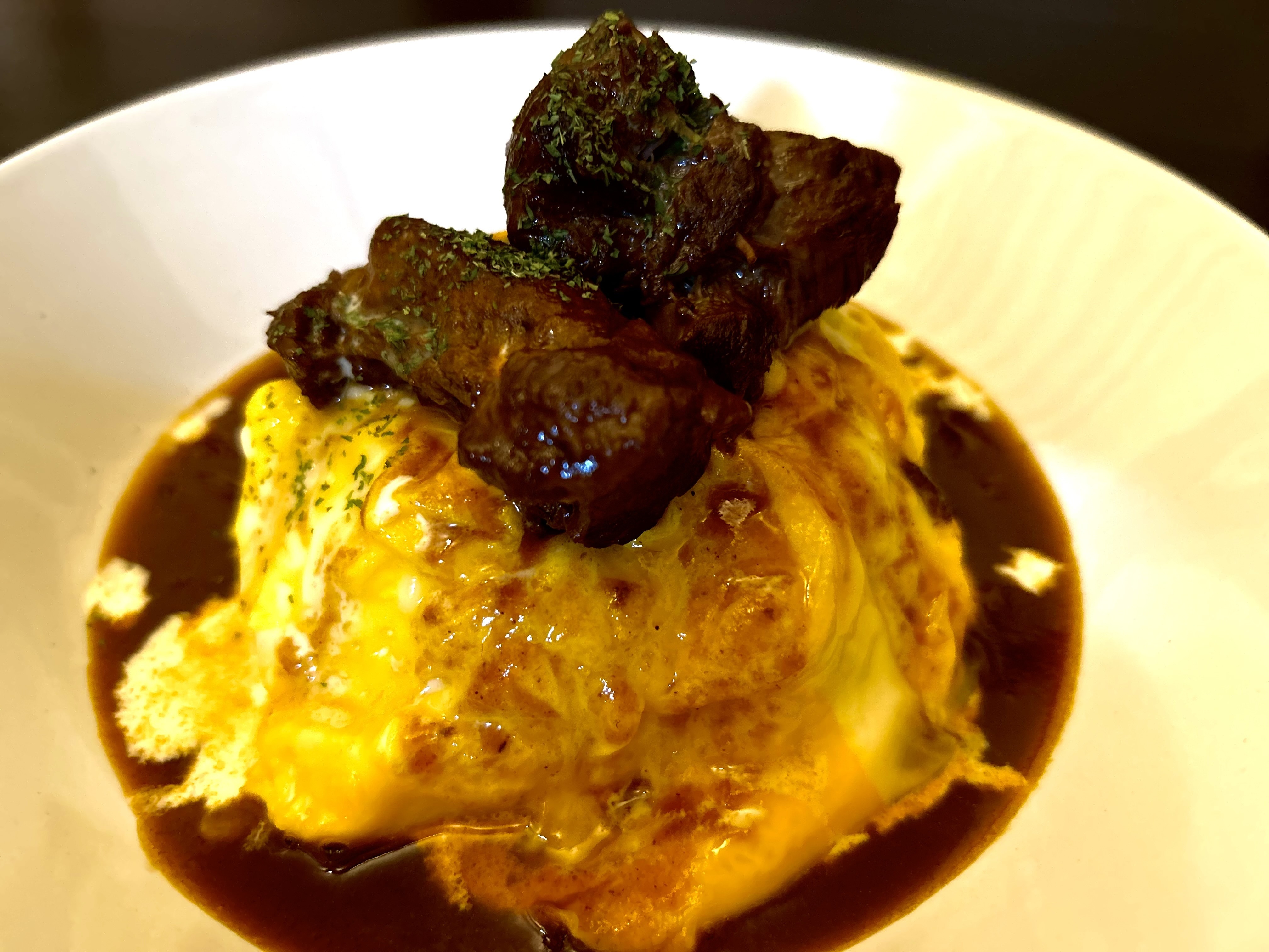 その上に、ふわトロ卵と自家製ソースやトッピングをあわせます。