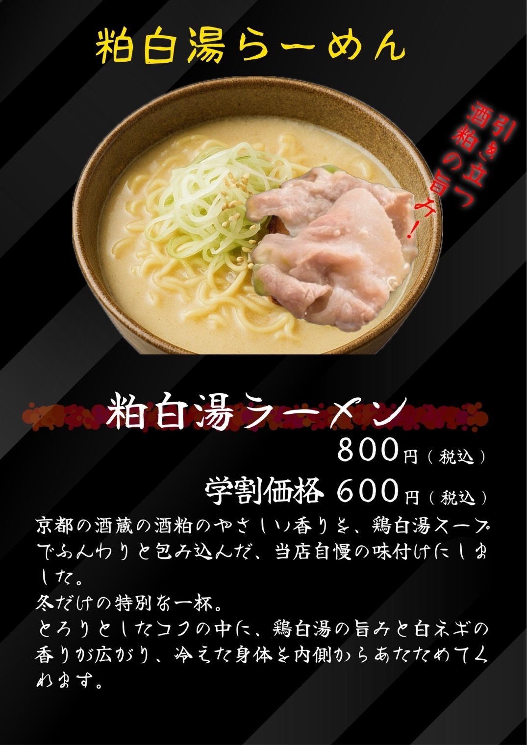 京都の酒蔵で採れた酒粕のやさしい香りを、鶏白湯スープでふんわりと包み込んだ、当店自慢の味付けにしました。冬だけの特別な一杯。とろりとしたコクの中に、鶏白湯の旨みと白ネギの香りが広がり、冷えた身体を内側からあたためてくれます。